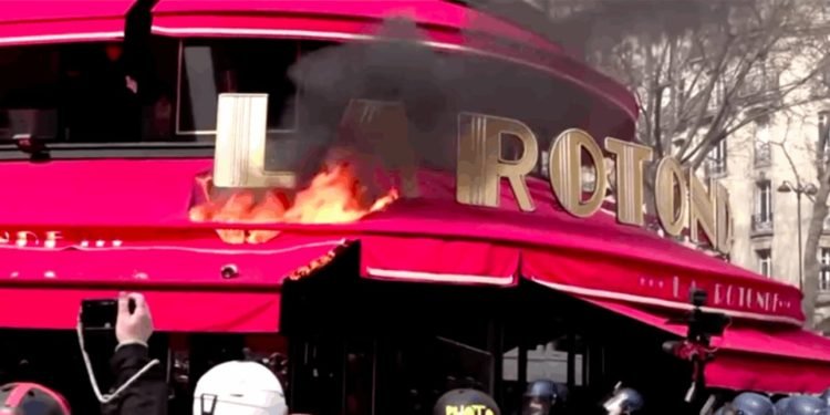 أضرم محتجون النار في أحد المطاعم المفضلة لدى الرئيس الفرنسي “إيمانويل ماكرون” في باريس خلال اشتباكات، أمس، مع شرطة مكافحة الشغب عند الضفة اليسرى لنهر السين.