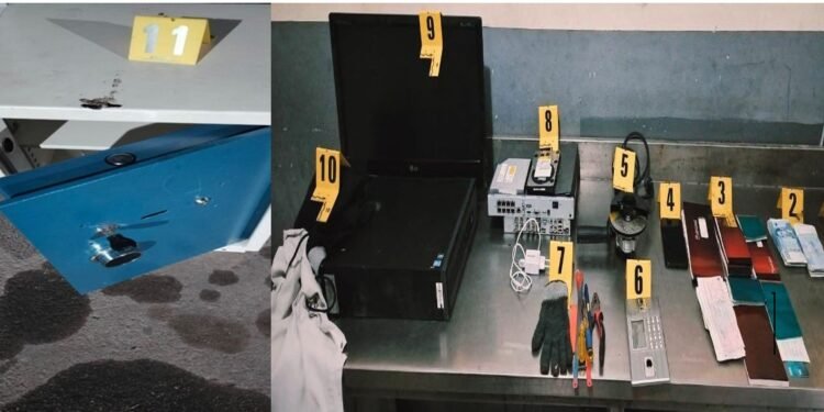 وقد أسفرت عمليات التفتيش المنجزة داخل منزل المشتبه فيه عن حجز الخزنة الحديدية المتحصلة من هذه السرقة، واسترجاع جزء من المبالغ المالية المسروقة، بالإضافة إلى مجموعة من الشيكات البنكية وسندات الأداء، فضلا عن حجز جهازين مخصصين لتخزين تسجيلات كاميرات المراقبة وجهاز تلفاز ووحدة مركزية للحاسوب، وكذا قفازين ومجموعة من المفاتيح والمعدات التي يشتبه في استعمالها في فتح الأقفال.