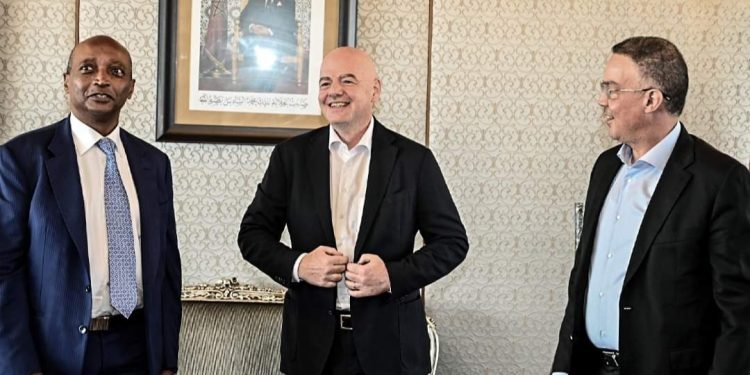 ووجد “إنفانتينو” في استقباله، كل من فوزي لقجع رئيس الجامعة الملكية المغربية لكرة القدم، و”باتريس موتسيبي” رئيس “الكاف”.