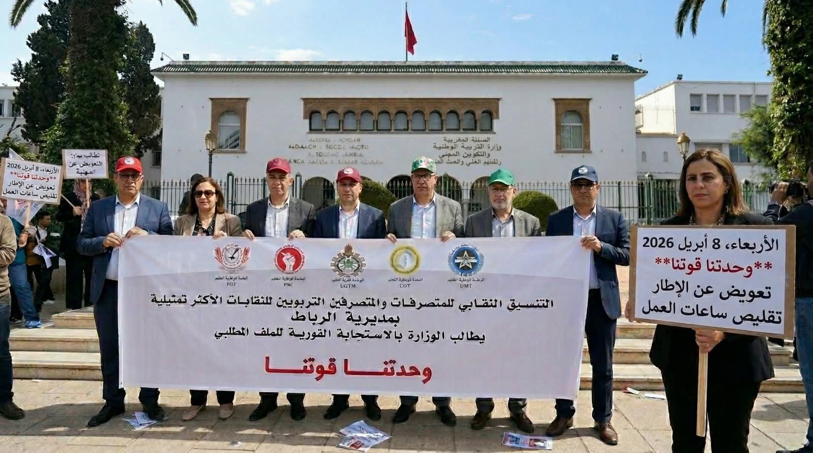 نفذ المتصرفون التربويون، اليوم، إضرابا وطنيا مرفوقا بوقفة احتجاجية أمام مقر وزارة التربية الوطنية والتعليم الأولي والرياضة بالرباط، استجابة لنداء التنسيقيات النقابية، وذلك احتجاجا على ما وصفوه باستمرار التمطيط والتسويف في التفاعل مع مطالبهم المهنية.