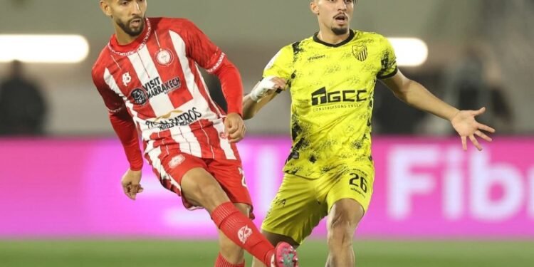 واستغل الفريق المراكشي النقص العددي في صفوف مضيفه، ونجح في تعديل النتيجة خلال الوقت بدل الضائع، عبر المهاجم خالد آيت بوطيب، ليحسم التعادل نتيجة اللقاء في لحظاته الأخيرة.