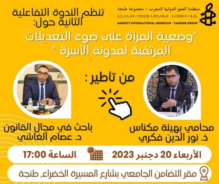 تنظم المجموعة المحلية لمنظمة العفو الدولية بطنجة ثاني لقاءاتها التفاعلية مع فعاليات سياسية ومجتمعية حول موضوع : “وضعية المرأة على ضوء التعديلات المرتقبة في مدونة الأسرة”، حيث تستضيف ممثلين عن كل من حزب التجمع الوطني للأحرار وعن حزب العدالة والتنمية.