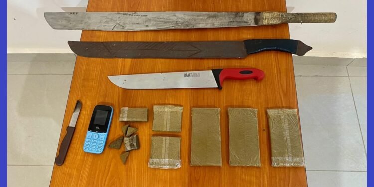 كما أسفرت عملية التفتيش التي أجريت بداخل مسكنه عن حجز أربعة صفائح من مخدر الشيرا بلغ وزنها 450 غراما، علاوة على ثلاثة سكاكين كبيرة الحجم، إثنين منها على شكل سيف، بالإضافة إلى سكين صغير الحجم خاص بتقطيع المخدر.