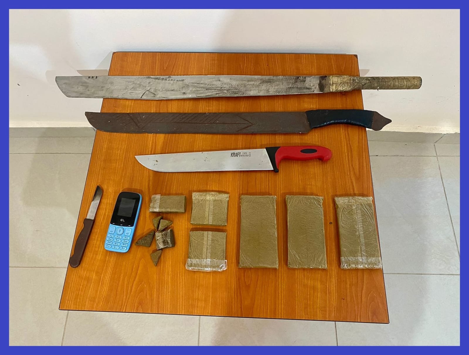 كما أسفرت عملية التفتيش التي أجريت بداخل مسكنه عن حجز أربعة صفائح من مخدر الشيرا بلغ وزنها 450 غراما، علاوة على ثلاثة سكاكين كبيرة الحجم، إثنين منها على شكل سيف، بالإضافة إلى سكين صغير الحجم خاص بتقطيع المخدر.