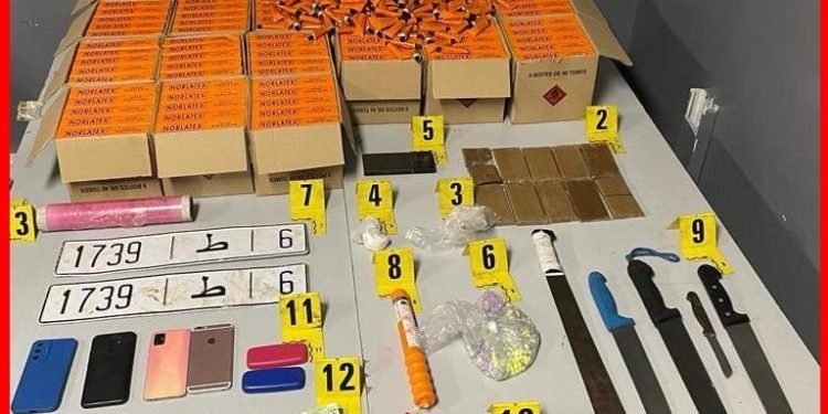 كما مكنت إجراءات التفتيش المنجزة بمنازل المشتبه فيهم من حجز ميزان إلكتروني ومواد للتلفيف ولوحتي ترقيم مزورتين للسيارات، فضلا عن سيوف وسكاكين وشهاب ناري يشتبه في حيازته لغرض ارتكاب اعتداءات جسدية.