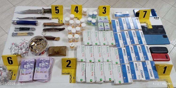 وجرى توقيف المشتبه فيهما بأحد أحياء مدينة طنجة، حيث أسفرت عملية الضبط والتفتيش عن العثور بحوزتهما على 1445 قرص طبي مخدر من أنواع مختلفة و100 غرام من مخدر الشيرا، علاوة على ثمانية أسلحة بيضاء ومبلغ مالي يشتبه في كونه من عائدات هذا النشاط الإجرامي.