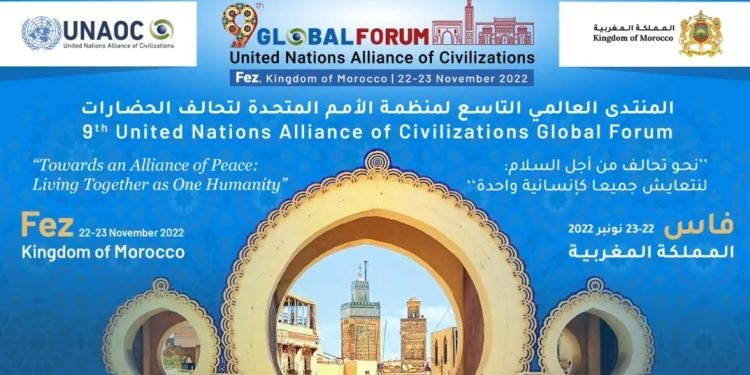 يستضيف المغرب، المنتدى العالمي التاسع لمنظمة الأمم المتحدة لتحالف الحضارات، والذي سينعقد يومي 22 و23 نونبر 2022 بفاس، تحت شعار، “نحو تحالف من أجل السلام: لنتعايش جميعا كإنسانية واحدة”. كما سيشهد هذا الحدث أيضاً تنظيم منتدى الشباب بالإضافة إلى العديد من الفعاليات