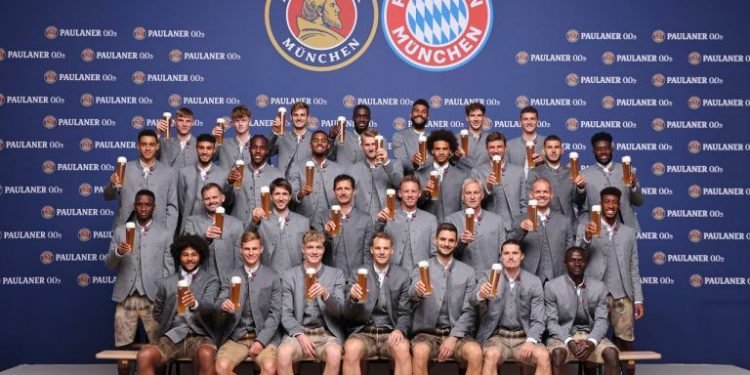 وحمل لاعبو بايرن ميونخ أكوابا من “البيرة” لشركة “باولانر”، أثناء جلسة التصوير الدعائية، مع ارتداء اللاعبين زي ليدرهوزن التقليدي.