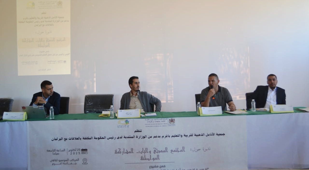 نظمت جمعية الأنامل الذهبية للتربية والتعليم، أمس، بالمركب السوسيو ثقافي بإغرم ندوة فكرية حول موضوع المجتمع المدني وآليات المشاركة المواطنة، وذلك في إطار مشروع “أفوس غ فوس” بدعم من الوزارة المنتدبة لدى رئيس الحكومة المكلفة بالعلاقات مع البرلمان.